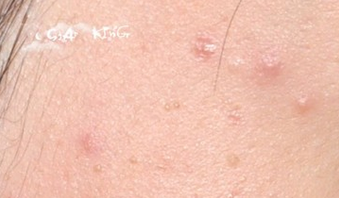 丘疹性粉刺:皮肤出现发炎的小丘疹,米粒或豌豆大,较为坚硬、密集,颜色为淡红色或深红色。有时在丘疹中间,可以看到黑头或顶端发黑的皮脂栓,偶尔有瘙痒或疼痛感。