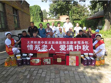 每个家庭都有老人,每个老人都需要来自家人以及社会各界的关怀和支持,太原肤康中医皮肤病医院作为唯一“2016健康中国行·三晋皮肤健康促进工程”的指定单位,将继续投身公益,关注社会弱势群体,让老人度过老有所养、老有所医、老有所享、老有所乐的晚年幸福时光,为创建和谐社会尽一份力量。