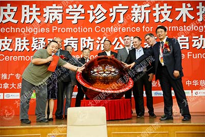 本次大会由中央电视台著名主持人董浩先生主持,原国家卫生部副部长 曹荣桂、中国医疗保健合作推广专业委员会秘书长何贤周,皮肤外 科协会会员(ISDS)保罗·帕克特,北美皮肤正规联盟加拿大轮值秘书约瑟 夫·布莱辛,澳大利亚麦考瑞大学医学院皮肤科教授路易斯·欧康纳等领导 嘉宾出席了本次会议。大会上,以曹荣桂、伦文辉等重要领导为首的嘉宾共 同按下皮肤疑难病防治公益基金启动球,启动皮肤疑难病防治公益基金 ,并为与会的各地患者代表颁发爱心援助基金。