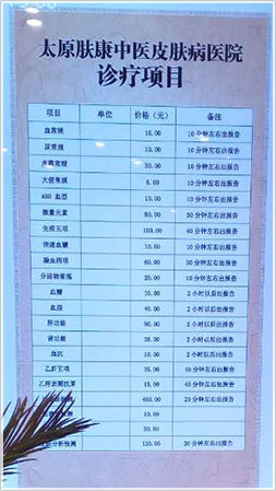 太原肤康中医皮肤病医院医疗服务项目价格与收费执行《山西省医疗服务项目价格》收费标准,部分手术按照特定医院标准收费。