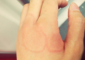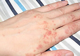 治疗前:刘女士的手上出现很多红色丘疹,手上特别痒同时还有烧灼感