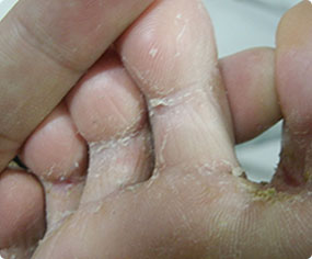 趾间糜烂型好发于第3、4或4、5趾间,表现为少量鳞屑,自觉奇痒。因搔抓易引起继发细菌感染,局部形成糜烂,湿润有渗液。