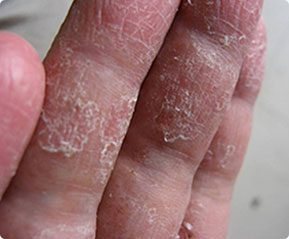 角化增厚型由水疱鳞屑型发展而成有多年病史,皮损无明显水疱或环形脱屑,掌面弥漫性发红增厚,皮纹加深皮肤粗糙,干而有脱屑。