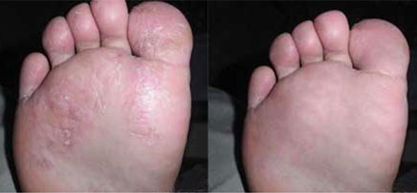 鳞屑角化型表现为足跖、足跟及足侧缘有局限性不整形嗜红色鳞屑性斑片,表面角化明显,粗糙干燥,境界清晰或不清晰。