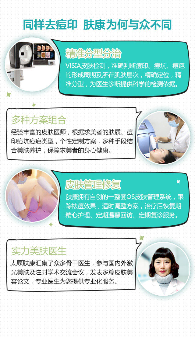 拥有好皮肤,才有高颜值! 肤康教你辨别痘印、痘坑、痘疤 红色痘印 平坦无凹凸 红色痘坑 皮下损伤 黑褐色痘印 色素沉着 痘疤 增生型 痘坑 凹陷型 我的痘印 怎么办?立即咨询 战“痘”多年去痘印还要入这些坑吗? 预约田艳伟医生 多种痘印类型 肤康分型祛除从此告别痘痘后遗症 新生痘印 红色/粉色 刚刚形成的红色痘印,医学上称为色沉,较容易祛除。 肤康方案 果酸焕颜/微针美塑 点击获取详细方案 痘坑 凹陷型 不当治疗或挤痘,伤及真皮层,留下轻微损伤凹陷。 肤康方案 果酸焕颜/彩光嫩肤/注射填充 点击获取详细方案 陈旧痘印 褐色/黑色 形成时间较长,色素已经沉着到真皮层,需医学祛除。 肤康方案 果酸焕颜/彩光嫩肤 点击获取详细方案 痘疤 增生型 长过痘痘的地方有明显红色突起,多为疤痕体质。 肤康方案 微针美塑/彩光嫩肤 点击获取详细方案 肤康分型祛痘印还原素颜平滑美肌 更多案例 我要咨询 更多案例 我要咨询 更多案例 我要咨询 我要预约
