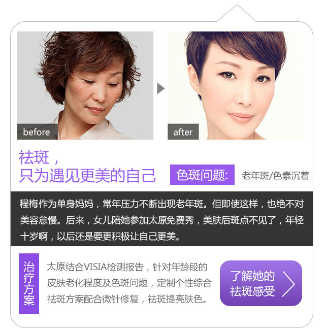 针对黄褐斑等顽固性色斑,以激光+中药调理综合祛斑,淡斑美白的同时,调理内分泌,内调外治有效攻克顽固斑。
