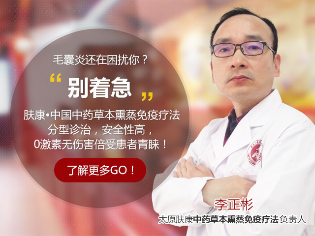 王某患顽固性毛囊炎5年多,每当上火的时候就开始发病,在脸上、头发、颈部等都有毛囊的地方都会出现,而且很疼,有时候不小心碰触一下,疼的钻心,很是痛苦! 经太原肤康中医皮肤病医院治疗两个疗程后,皮损部位就已经完全恢复正常了。